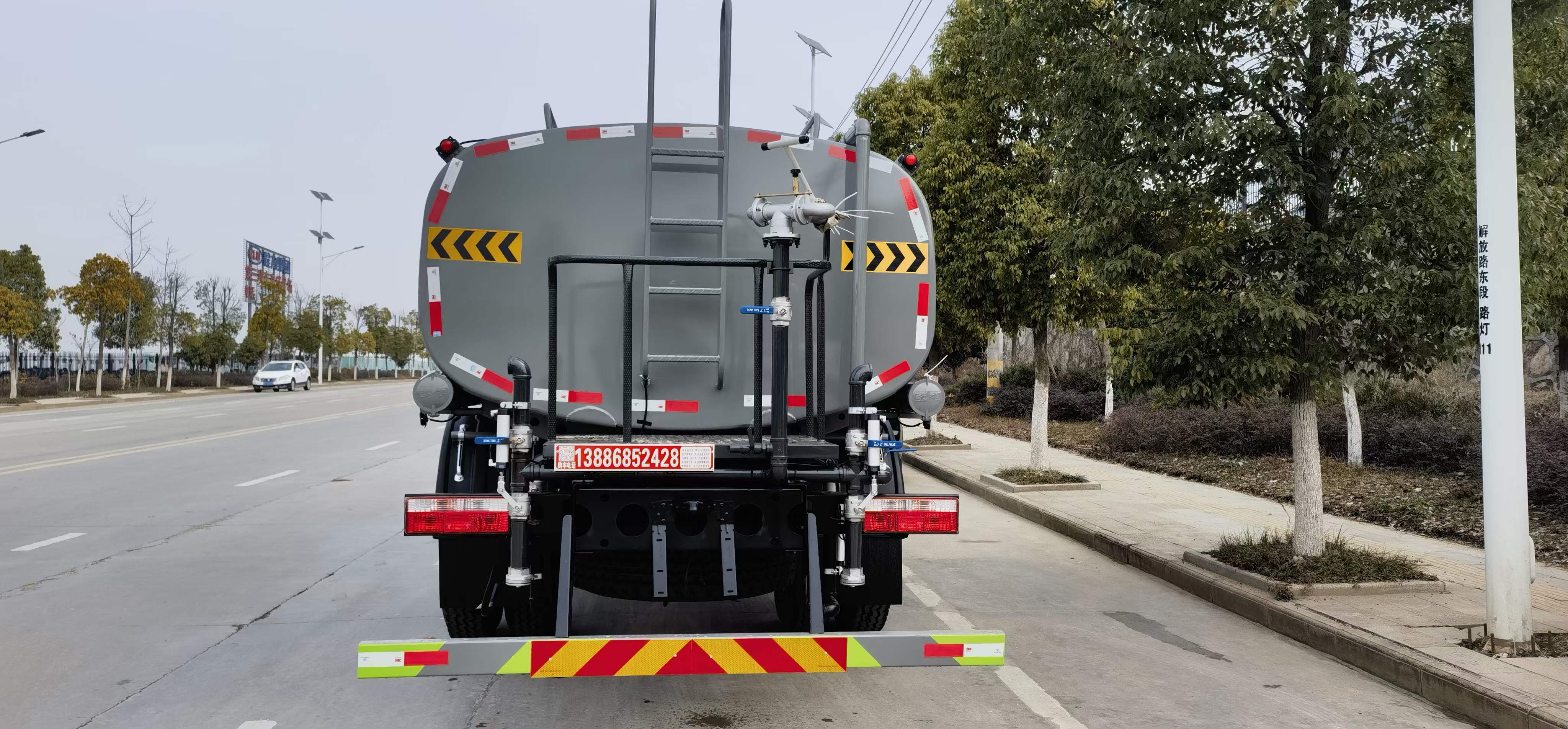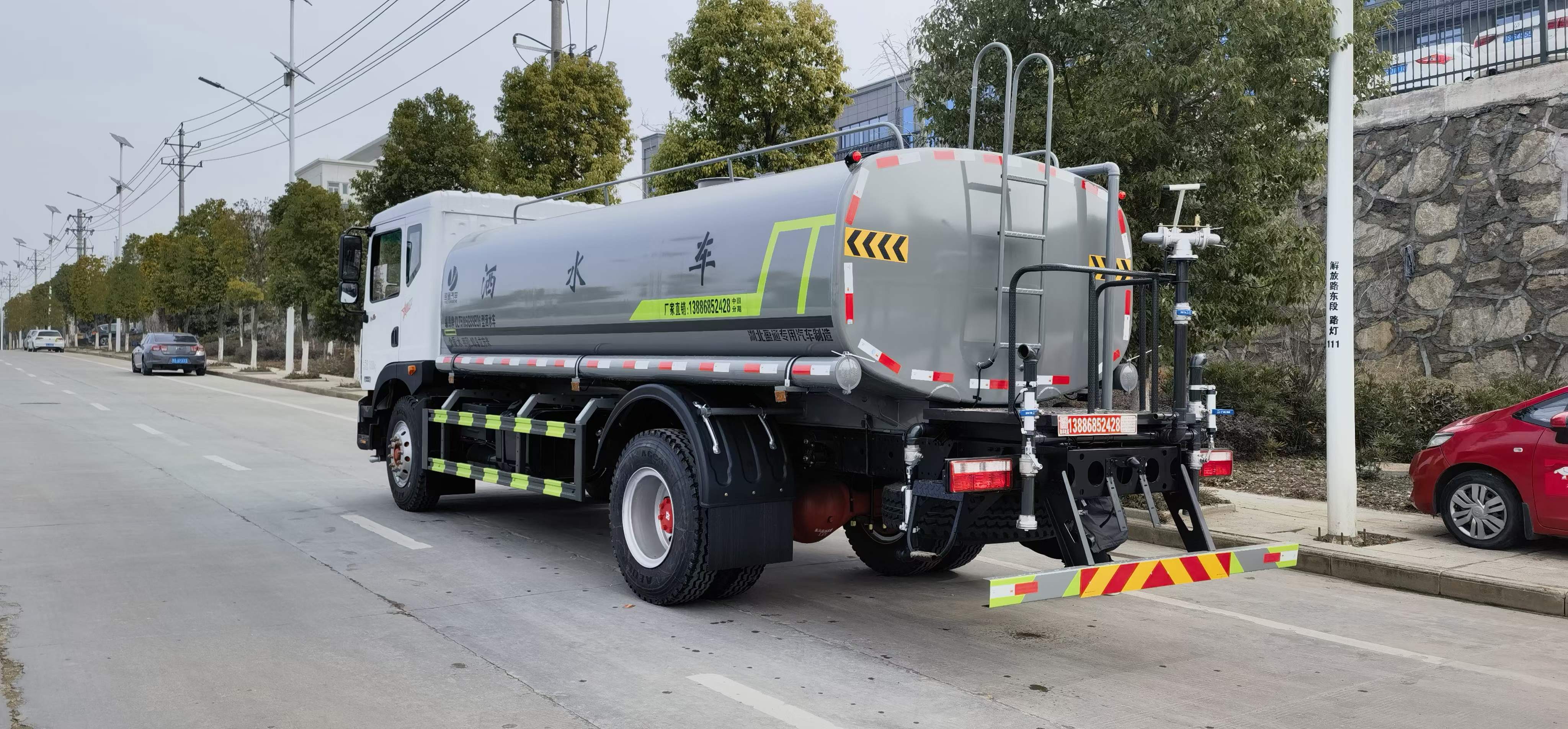 5立方,罐體采用國(guó)標(biāo)Q235碳鋼材質(zhì),罐體厚度4MM,前后封頭5MM加厚型,罐體內(nèi)雙層隔板具有防波蕩作用,以減輕汽車行駛時(shí)罐內(nèi)液體沖擊;灑整車及外形尺寸嚴(yán)格按照機(jī)動(dòng)車公告制作而成;裝配大功率灑水泵,前沖、后灑、側(cè)噴、后平臺(tái)帶綠化灑水炮,灑水炮可旋轉(zhuǎn),可連續(xù)調(diào)成直沖狀、大雨、小雨、毛毛雨;工作范圍:自吸高度:≥7m,灑水寬度:≥14m,射程:≥16m;可調(diào)節(jié)成柱狀,射程≥20m;也可調(diào)節(jié)成霧狀;射程≥5m。配消防接口,自流閥,濾網(wǎng),帶自吸自排功能。前封頭帶水位計(jì),后平臺(tái)主管路帶1寸澆花接口,后爬梯,帶1個(gè)消防接頭,帶1個(gè)自流閥,1個(gè)過(guò)濾裝置,其余標(biāo)配。1、可選裝后平臺(tái)帶霧炮機(jī)組用于噴霧降塵、農(nóng)藥噴灑;2、可選裝前置電子灑水炮駕駛室操作;3、可選裝氣動(dòng)球閥駕駛室操作。